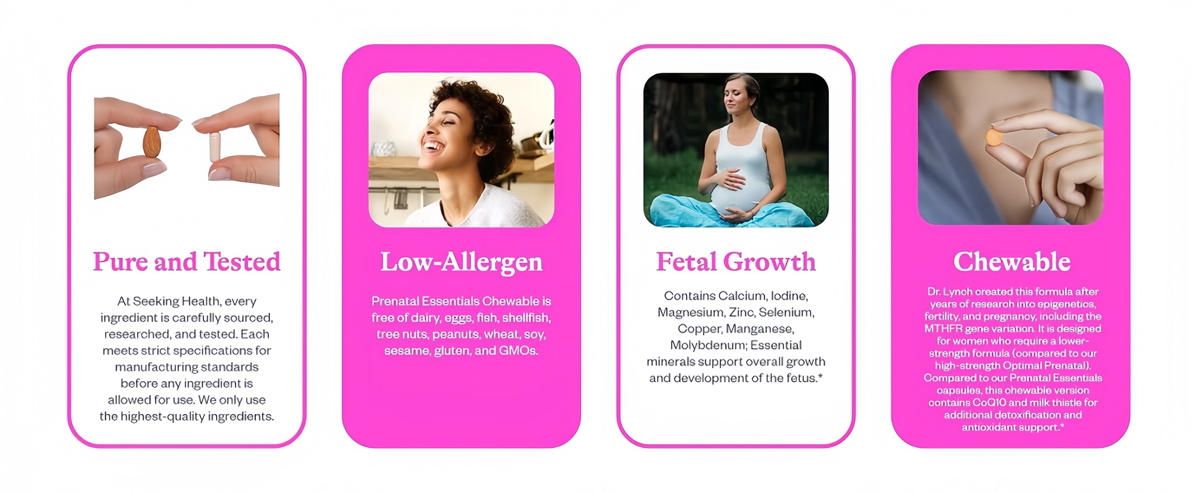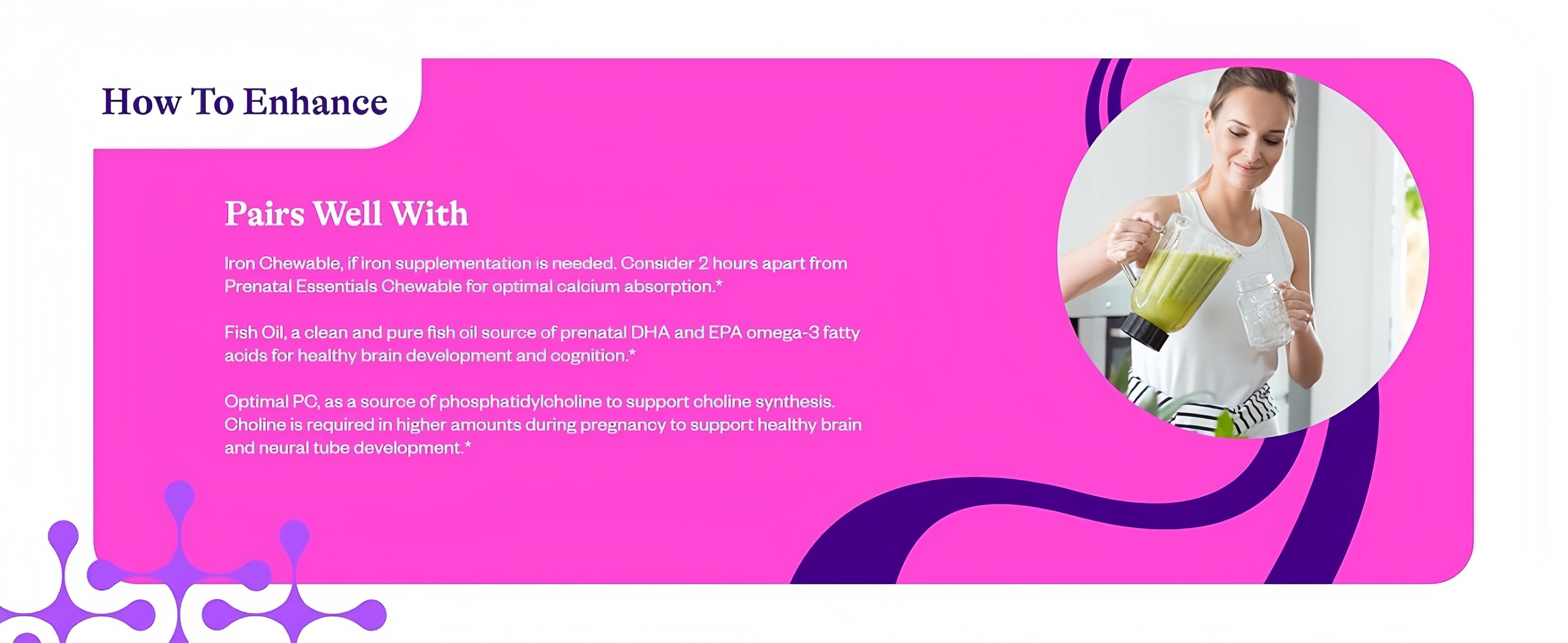 Prenatal Essentials Chewable features well-absorbed vitamins andchelated minerals. Your body (and baby's body) can easily recognize andutilize these bioavailable forms.Supporting wellness and comfort duringpregnancy has never been easier. Now, you can cover your prenatal baseswith only two delicious chewable tablets a day!*